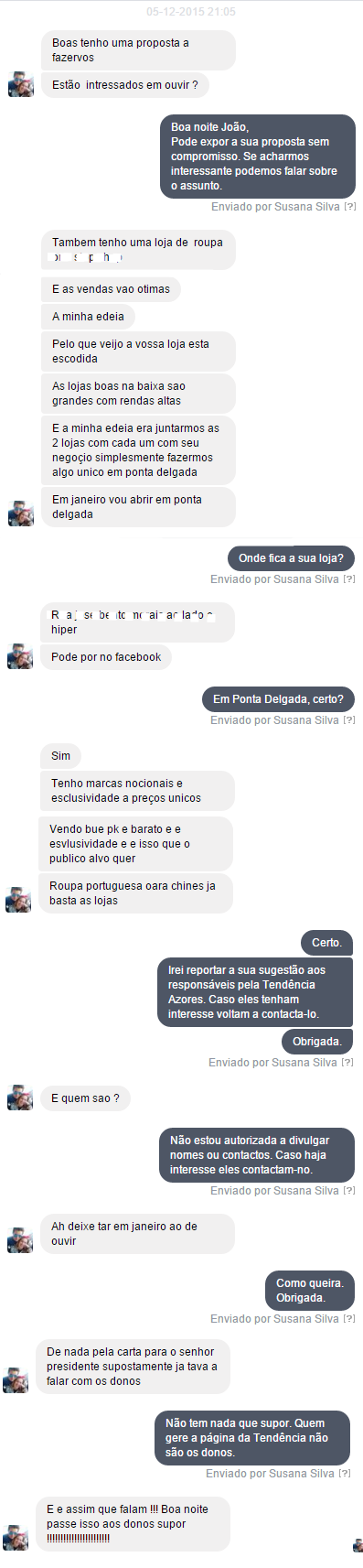Umas semanas depois o mesmo rapaz volta a enviar uma mensagem privada para a loja a dizer que tinha uma proposta para nos fazer. Na altura estávamos na fase da carta aberta ao Presidente da Câmara (logo, uma fase sensível e difícil para nós porque tínhamos todas as hipóteses de ir embora em cima da mesa).