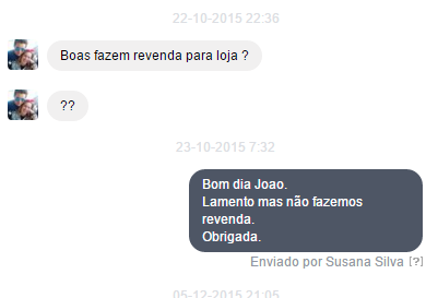 No ano passado uma rapaz mandou uma mensagem privada para a loja a perguntar se fazíamos revenda. Eu disse-lhe que não.